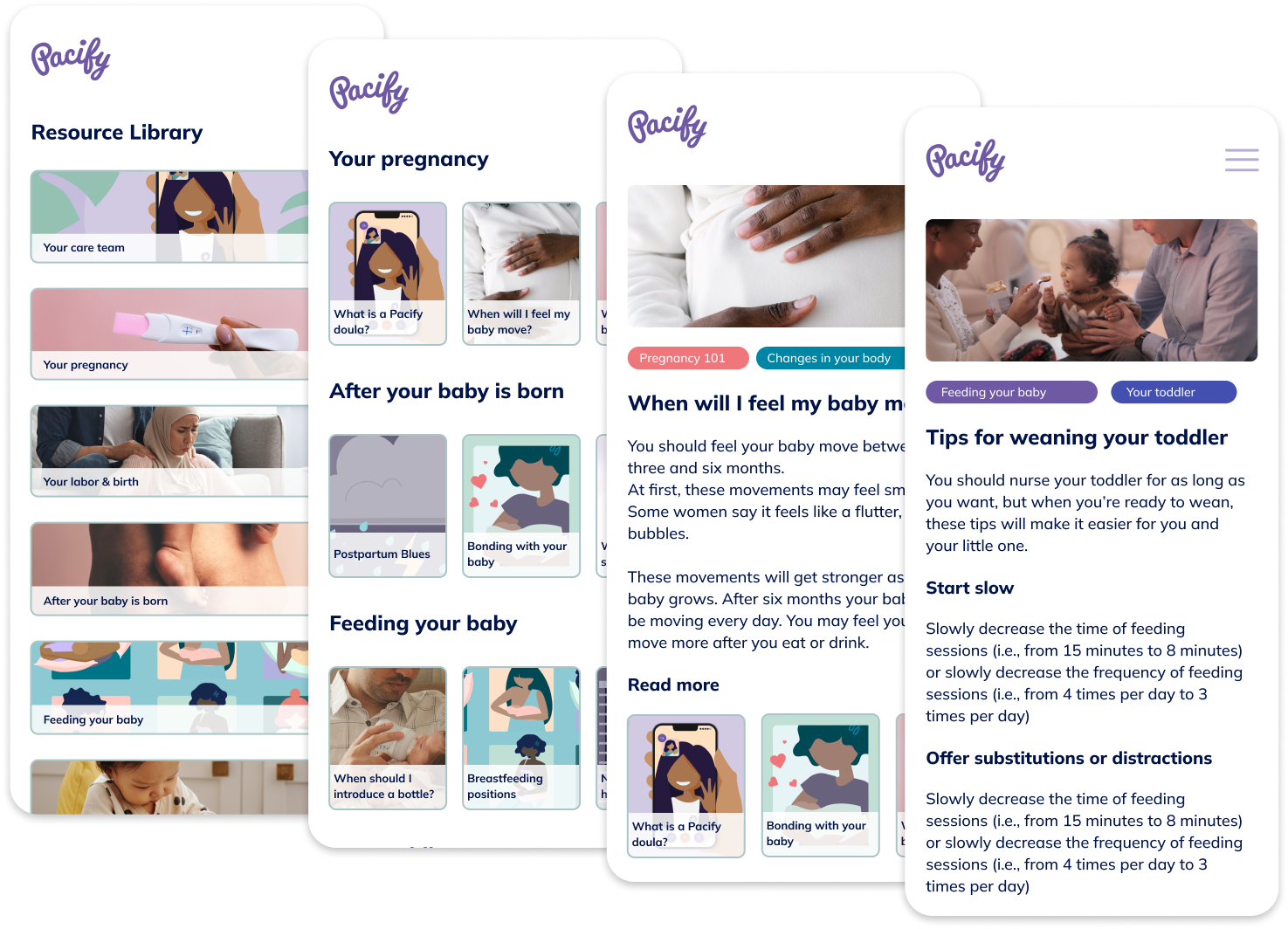 The Pacify Library is a child product of the Pacify mobile app, which connects new & expecting parents to maternal health specialists. The Library is a rich archive of educational content surrounding the perinatal journey and the process of becoming a parent. It contains articles & guides, frequently asked questions from parents, videos, and more.